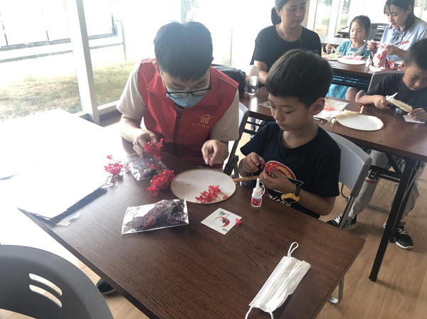 博物馆工作人员在活动开始前介绍了关于立秋和团扇的文化知识,通过PPT为大家介绍了团扇的由来和制作方法,同学们全神贯注地聆听了老师讲解。工作人员为孩子们准备了空白扇子、种类丰富的干花以及参考图案,同学们在工作人员的指导下,在空白的扇面上,拿起胶水、剪刀,仔细临摹和创造。