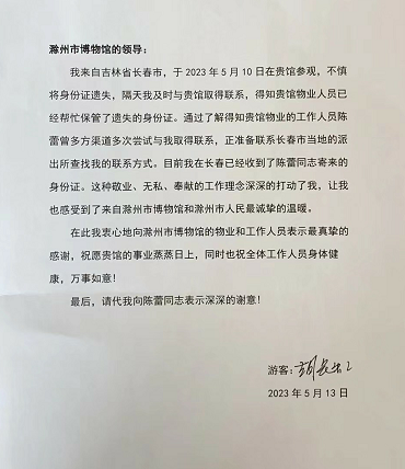 2023年5月10日,外地游客胡先生在市博物馆参观时,不慎将身份证遗失在馆内,博物馆工作人员在捡到身份证后第一时间与胡先生取得联系,并用加急快递将身份证寄给胡先生。胡先生收到身份证后,为表达对滁州市博物馆和博物馆工作人员陈蕾同志的感谢,写了一封感谢信。