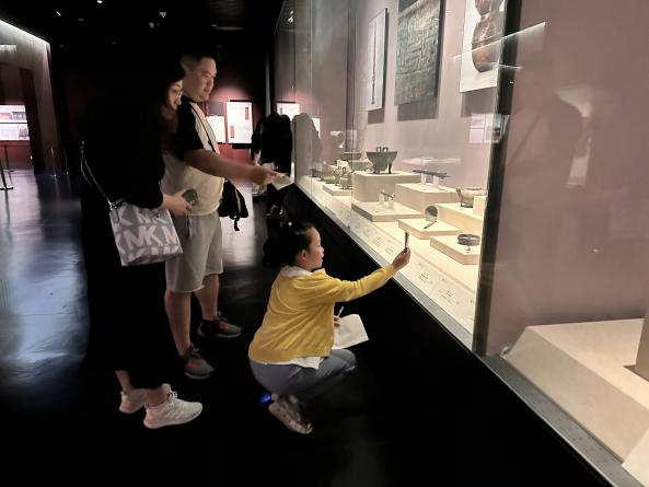活动分为“展厅寻宝”、“宝物分享”和“积分换宝”三个环节。讲解员老师特制了一张张文物卡片,每位同学领取三张,在博物馆不同展厅找到对应文物,记录下文物的名称、年代、出土地点等相关信息。老师根据他们对藏品解读的完整性,给与对应的积分。再次领取卡片,寻找、记录、兑分,如此循环。在寻宝的过程中,同学们也增进了对博物馆文物的了解,切身感受到博物馆的魅力和深度。
