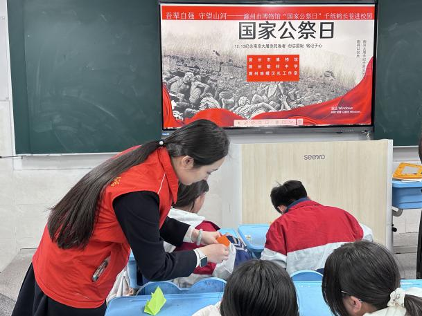 为铭记历史伤痛、缅怀遇难同胞,传承和平理念、厚植爱国情怀,12月12日下午,滁州市博物馆走进敬梓中学,开展“吾辈自强,守望山河——国家公祭日千纸鹤共创和平长卷”主题活动,该校100余名初二学生参与活动,在沉浸式体验中感悟历史重量与青年担当。