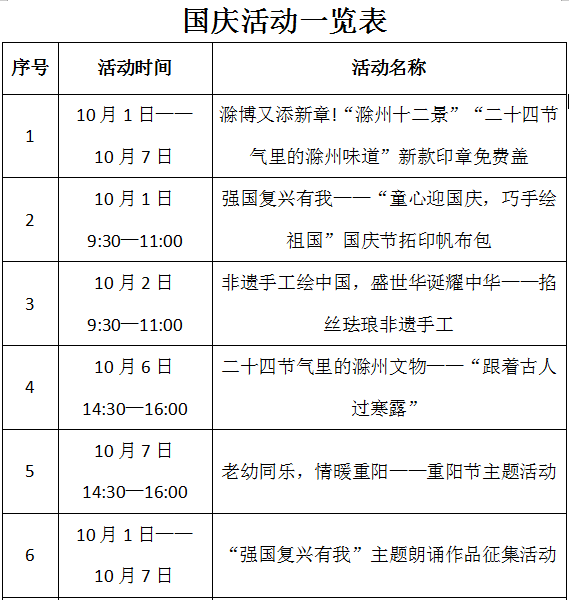 为热烈庆祝中华人民共和国成立75周年,让更多的市民走进博物馆,了解滁州的历史文化,10月1日至7日,滁州市博物馆准备了一系列活动,每个主题精彩不重样,喜迎国庆,别再犹豫,快来打卡吧。