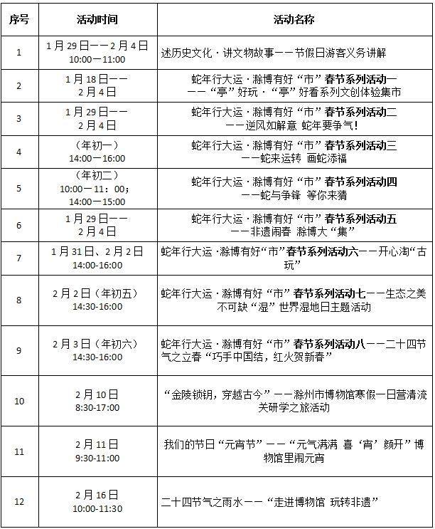 活动内容:为了让广大群众在春节期间感受欢快的节日气氛,同时给大家提供一个娱乐、互动交流的平台,滁州市博物馆特开展“蛇年行大运·滁博等你来”——蛇来运转,画蛇添福活动!大家只需在现场领号就有机会参与活动哦,画好的作品我们将装饰在滁州市博物馆内,不论是大朋友还是小朋友都可以参与,让我们一起画蛇添福吧!