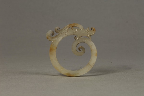 玉龙,1991年在天长三角圩一号汉墓出土。玉龙造型非常独特,用白玉制成,具有和谐、统一、整体的美感。龙头和龙尾首尾相连,龙首衔尾如环,尾尖向内打卷,龙杏眼出梢,嘴大张衔尾,上下唇前卷后翻,獠牙勾尾,鬓发分叉后飘,身体上阴刻两勾云纹。其造型形象结实、身躯矫健,而且身体扭曲如环,游动感强,充满着无限生机与活力,有很强的艺术表现力。
